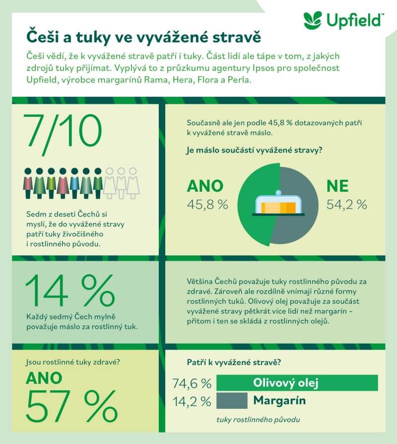 K zdravému životnímu stylu patří vyvážená a pestrá strava. Většina Čechů se v základech vyvážené výživy teoreticky orientuje. V praxi ale mnoho lidí tápe v tom, z jakých zdrojů přijímat jednotlivé složky stravy, jako jsou tuky. Ukázal to průzkum agentury Ipsos pro společnost Upfield, výrobce margarínů Rama, Hera, Flora a Perla.